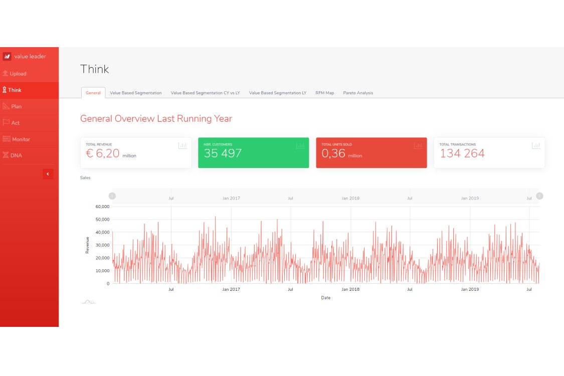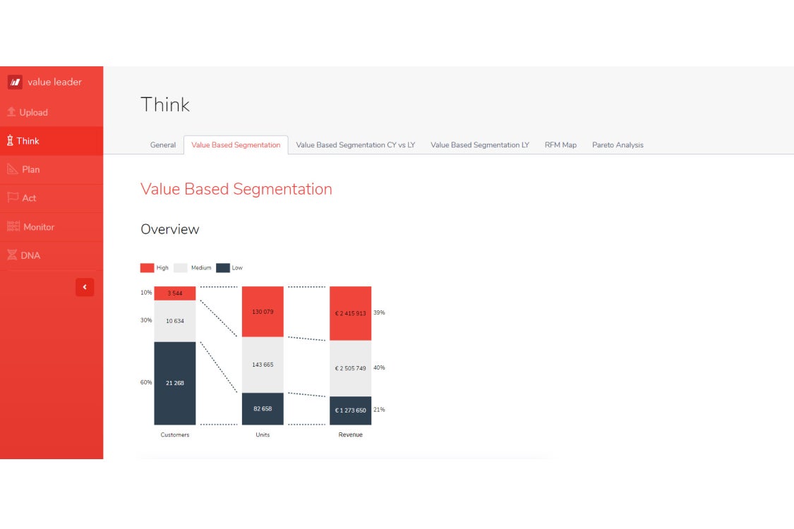 ValueLeader generates fast AI-driven insights based on your customer data. By leveraging your historical sales transactions, we discover new insights based on value based segmentation, customer churn and RFM.