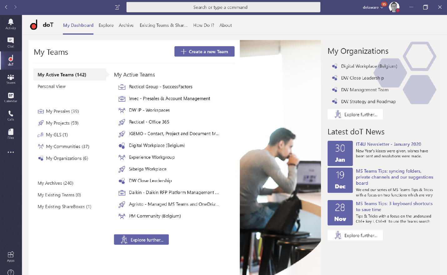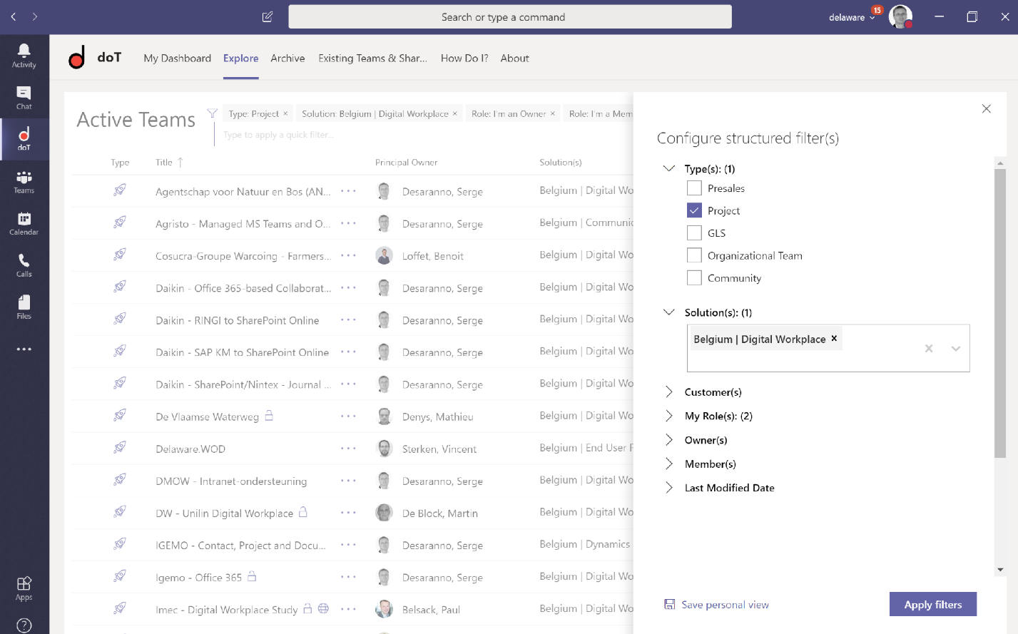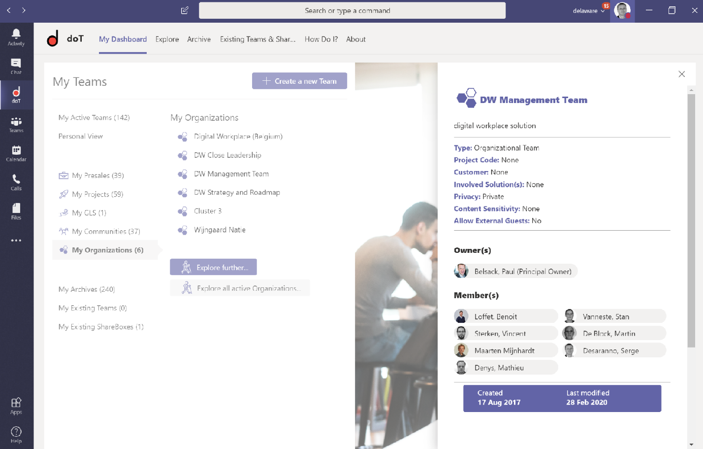 - provides a personalized dashboard, with views on active Teams, archived Teams, all Teams, with free text search and filtering capabilities based on contextual parameters