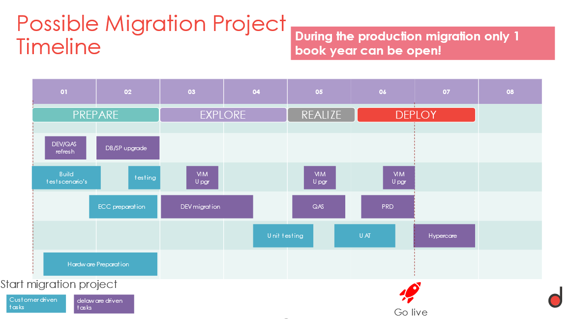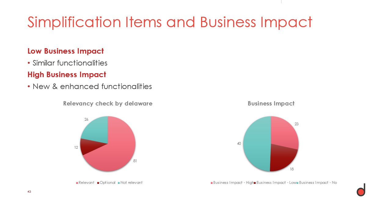 We scan your current ECC system by using the SAP Readiness Check reports combined with delaware tools and experience. We identify Business impact and potential showstoppers, analyze the existing custom code, suggest a migration approach and estimate a number of days needed, based on our previous S/4HANA conversion experiences.