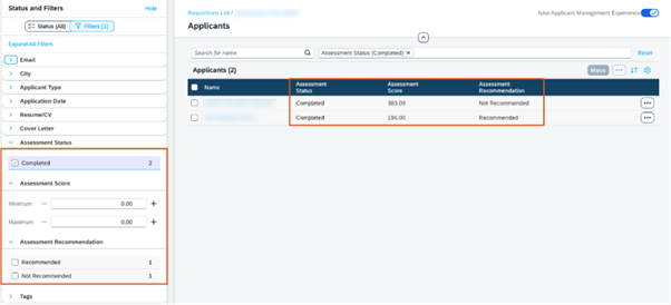 • Recruiters can now filter applicants by assessment score and recommendation, making it faster to identify top-fit candidates.